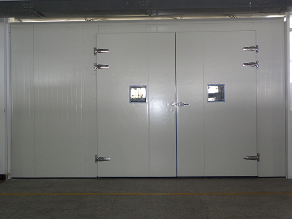 高溫老化房設(shè)備的門與箱體之間采用自吸式耐熱之高張性密封條以確保測試區(qū)的密閉。大門內(nèi)板材料為不銹鋼制成,并采用集裝箱扣式把手,門的尺寸為2500寬×2700 高雙開門。